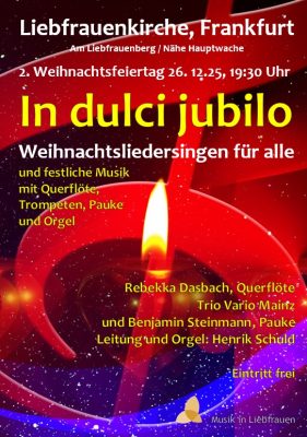 Am 2. Weihnachtsfeiertag um 19:30 Uhr findet wieder ein Weihnachtskonzert in der Frankfurter Liebfrauenkirche (Am Liebfrauenberg) statt. Wir laden ein zum Offenen Weihnachtsliedersingen mit festlicher Musik für Trompeten, Orgel und Pauke.