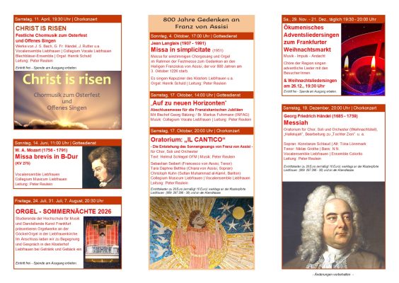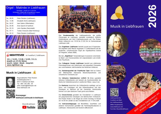 Auch im Jahr 2026 lädt die Frankfurter Liebfrauenkirche wieder zu vielen musikalischen Höhepunkten ein. Bitte klicken sie hier!